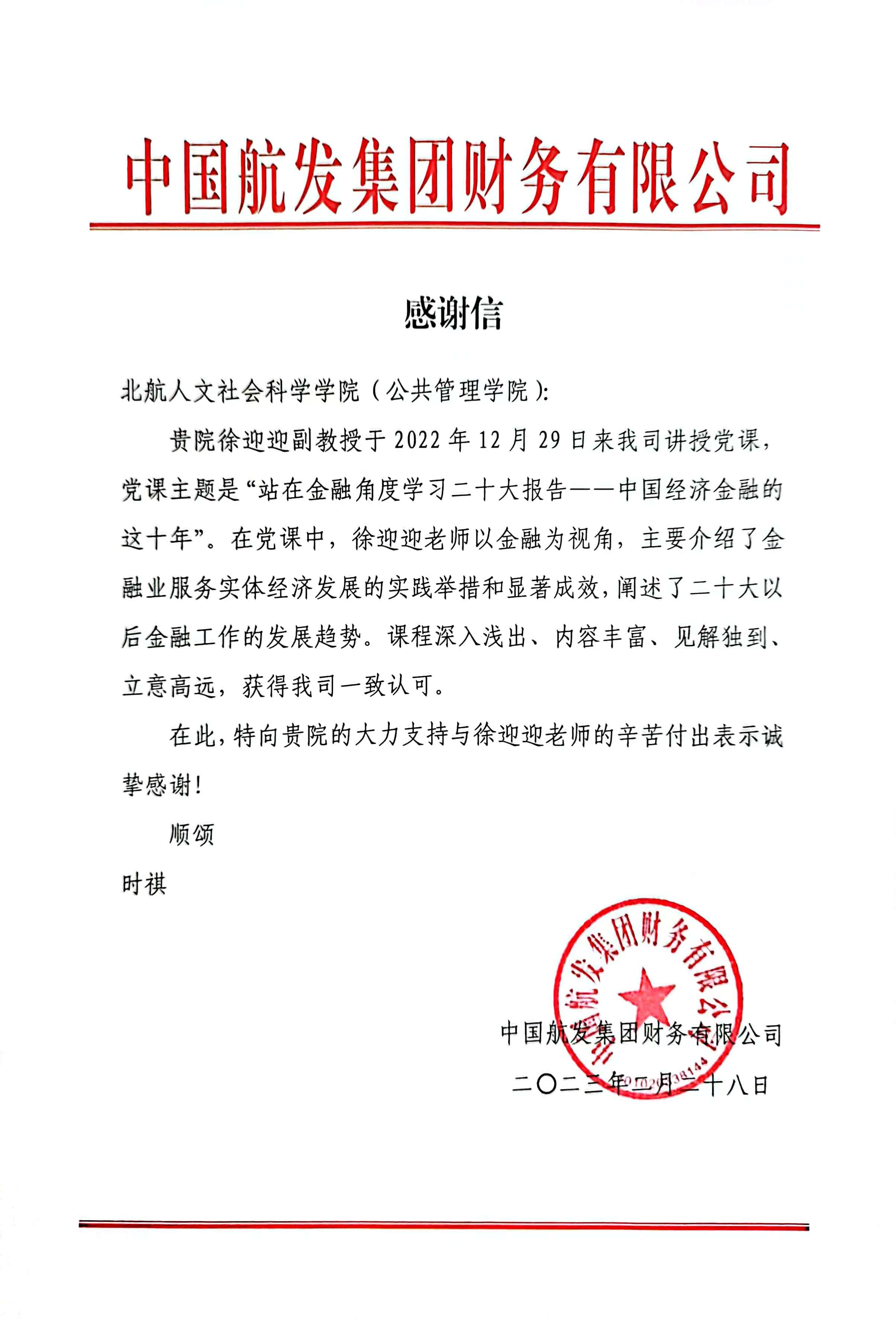 近日,北京航空航天大学人文社会科学学院(公共管理学院)收到来自中国航发集团财务有限公司的感谢信。感谢我院徐迎迎副教授于2022年12月29日赴该司讲授党课,党课主题是“站在金融角度学习二十大报告——中国经济金融的这十年”。