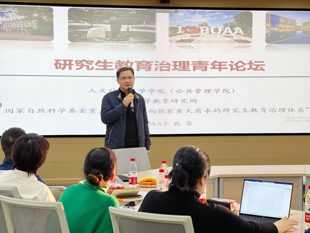 1月3日下午,研究生教育治理青年论坛在北航人文公管学院大楼三层智慧课堂举行,论坛由北航人文公管学院高等教育研究所主办。中国博士教育研究中心主任、《北京大学教育评论》主编、北京大学教育学院教授陈洪捷,北京大学教育学院长聘副教授沈文钦;北航人文公管学院院长蔡劲松教授、高等教育研究所所长赵世奎教授等参加。论坛由赵世奎所长主持。