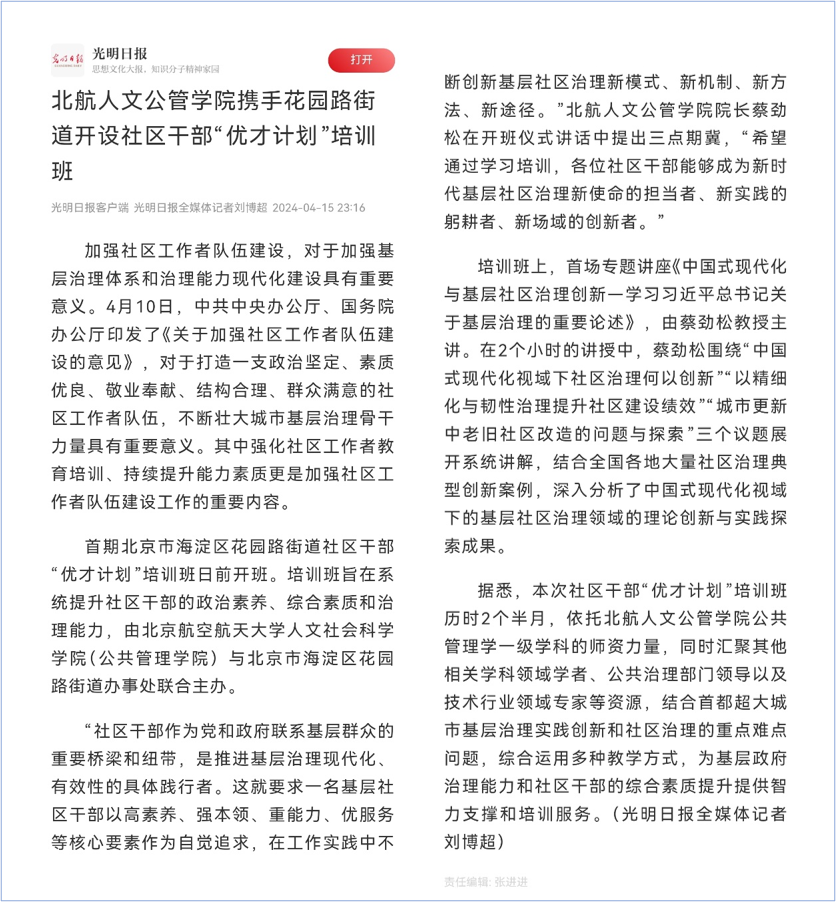 编者按:2024年4月15日,《光明日报》客户端刊发我院携手北京海淀区花园路街道开设社区干部“优才计划”培训班的报道,特予以转发,以飨读者。