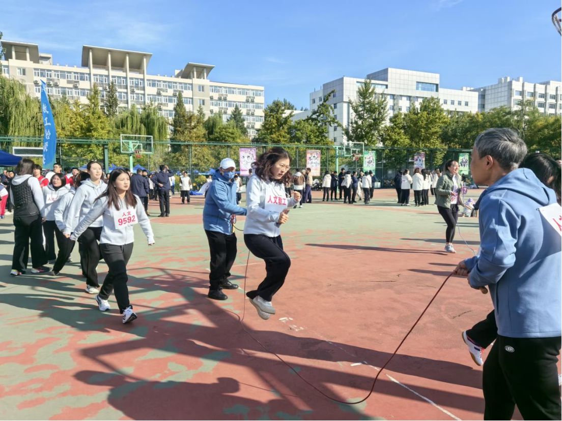 教职工跳绳比赛是最先开始的集体项目,在师生们的呐喊助威声中,我院10名教职工组成的代表队依次以“8”字路线在3分钟内跑跳进出绳,大家团结协作展现出了不俗的实力。