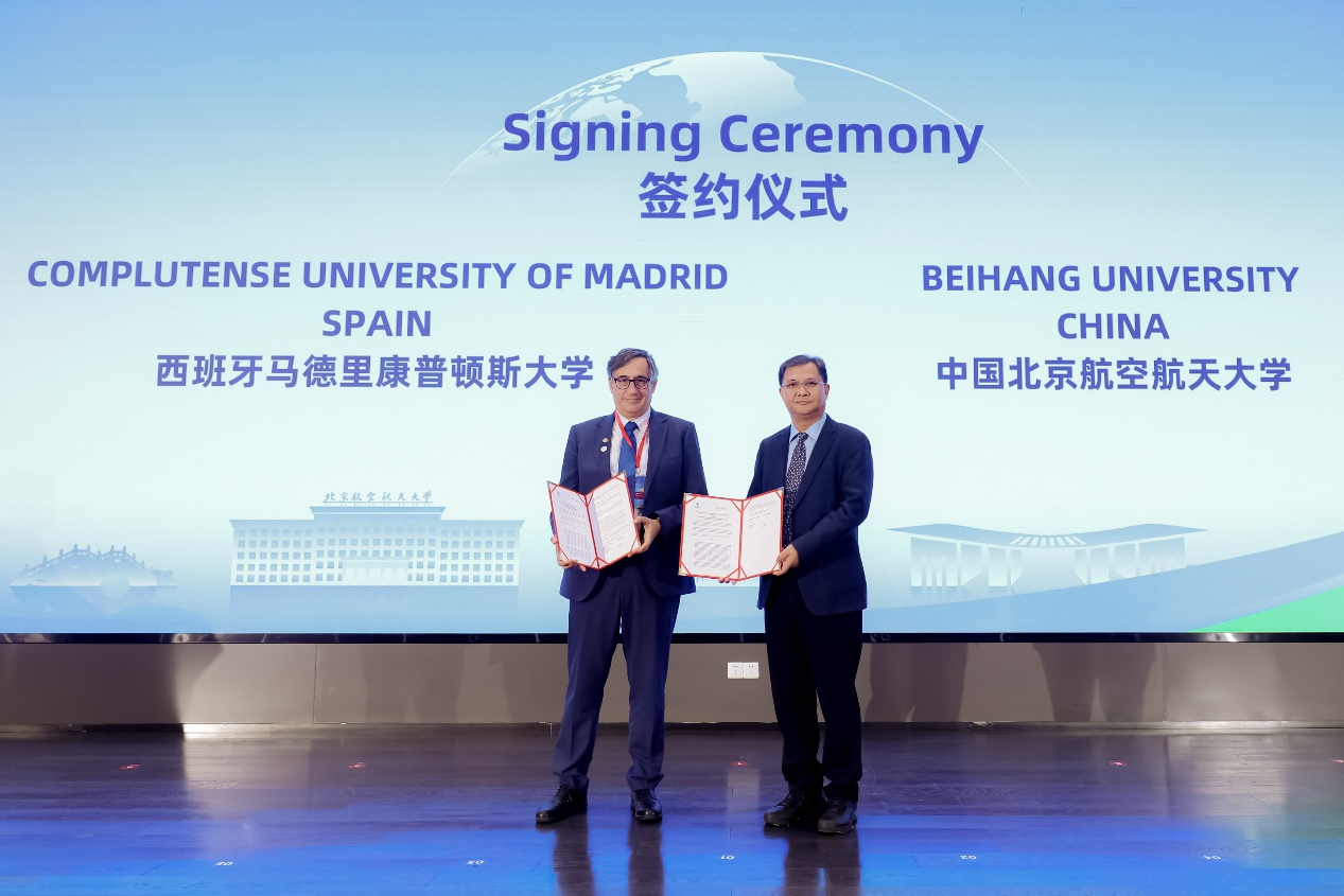 在北京航空航天大学第二届全球合作伙伴峰会期间,蔡劲松院长与Jover教授共同签署了两校合作协议,标志着北航与马德里康普顿斯大学的合作关系进入新阶段。