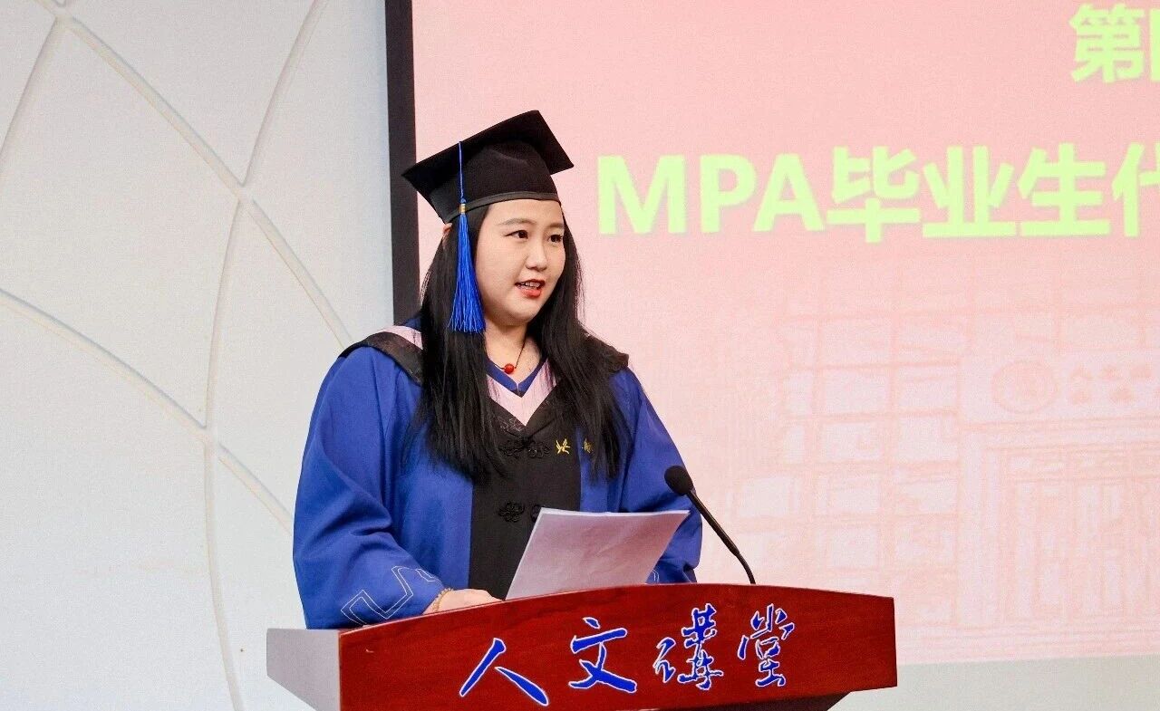 MPA毕业生代表张琪琛同学在发言中回忆了在职求学期间,在工作、家庭与学业之间奔波平衡的难忘经历,表达了对学校栽培、恩师教诲与家人支持的感恩之情。她谈到,这段求学时光不仅是知识体系的重塑,更是精神境界的升华,北航精神早已融入血脉,未来将带着这份使命情怀,深耕公共服务领域,用专业能力回馈社会。
