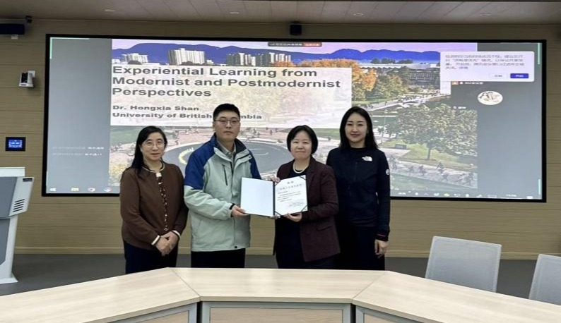 最后,人文公管学院院长助理刘贤伟副教授为单红霞教授颁发了“人文讲堂”证书,单老师与本院长期合作,已联合培养博士生、共同发表SCI论文,未来将会继续合作,共同推进中加研究生教育学的研究与交流。