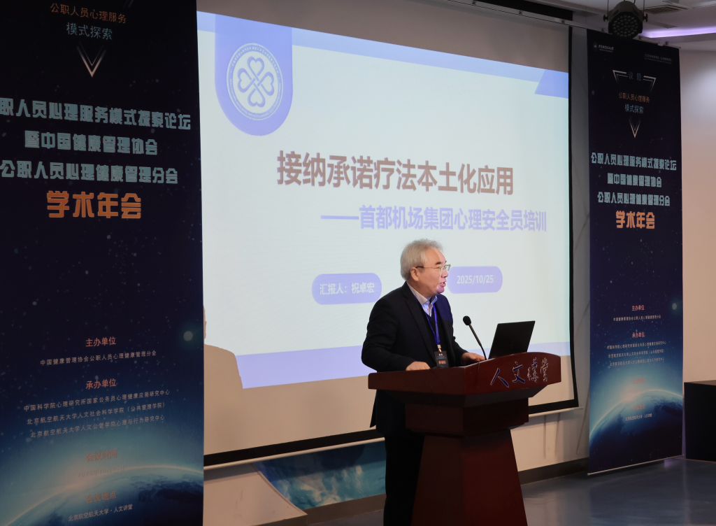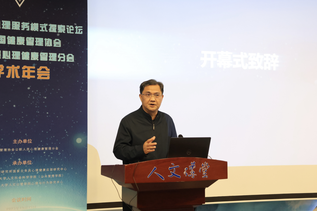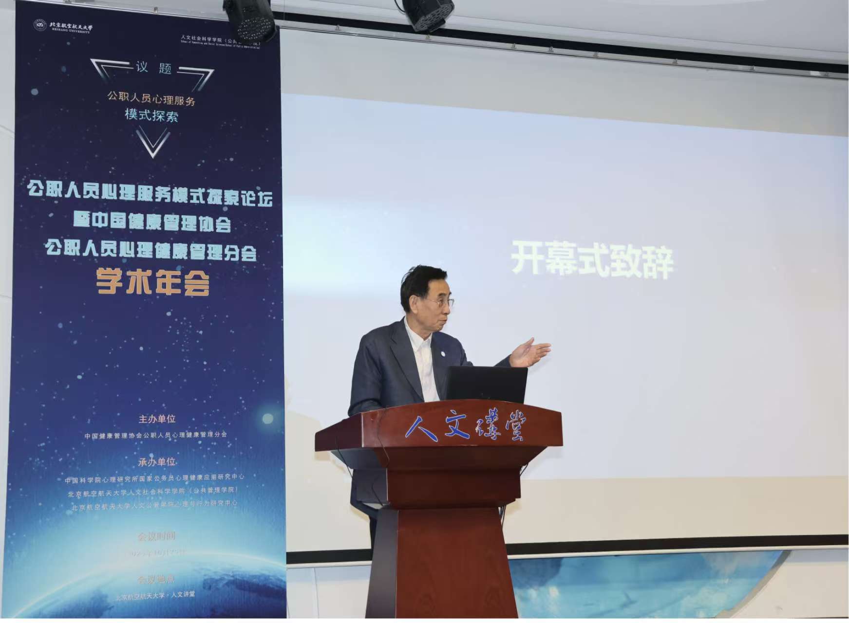 10月25日,由中国健康管理协会公职人员心理健康管理分会主办,中国科学院心理研究所国家公务员心理健康应用研究中心、北京航空航天大学人文社会科学学院(公共管理学院)、北京航空航天大学人文公管学院心理与行为研究中心共同承办的全国公职人员心理服务模式探索论坛暨公职人员心理健康管理分会学术年会在北京航空航天大学人文讲堂召开。论坛由中国科学院心理研究所教授祝卓宏主持,由中国健康管理协会监事会监事长郭齐祥、中国健康管理协会公职人员心理健康管理分会会长张建新、北京航空航天大学人文公管学院院长蔡劲松教授致辞。