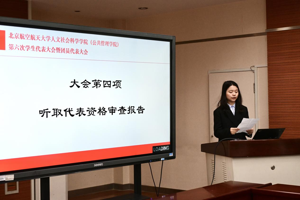 大会先后听取并审议了代表资格审查情况报告、《北京航空航天大学人文社会科学学院(公共管理学院)团委工作报告》、《北京航空航天大学人文社会科学学院(公共管理学院)第五届学生会工作报告》。与会代表对报告表示充分肯定。经表决,大会一致通过了各项工作报告。