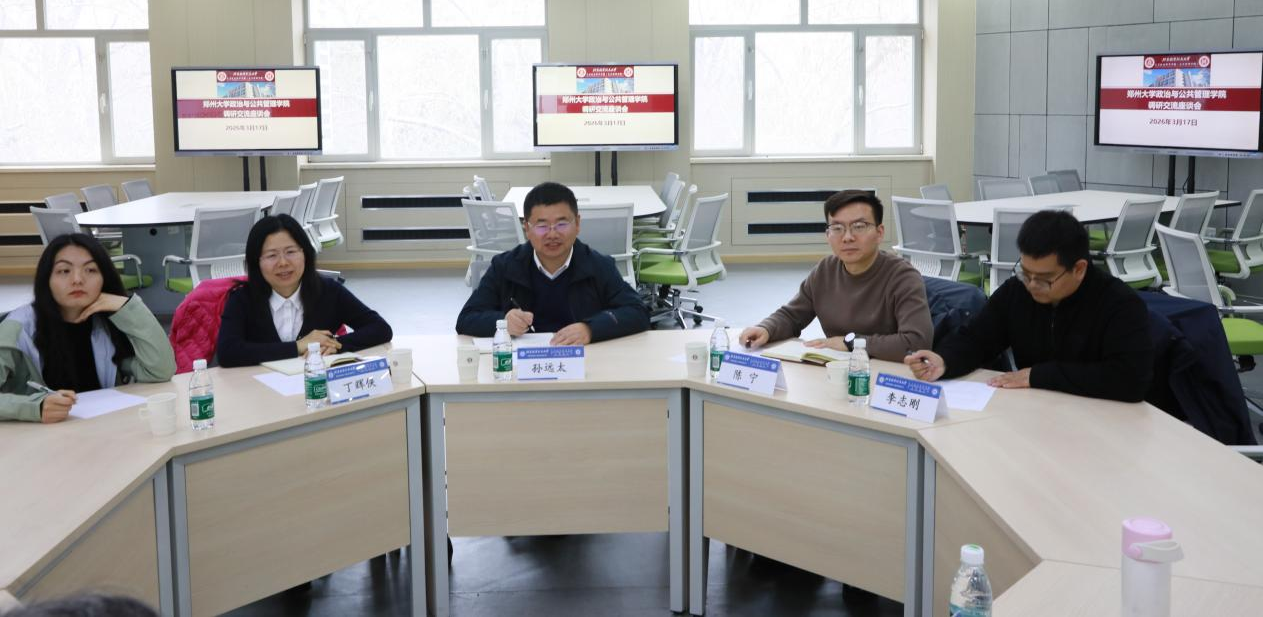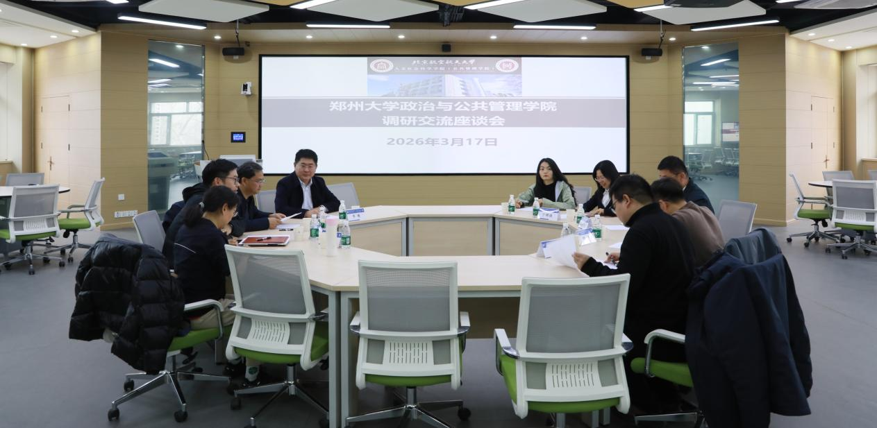 2026年3月17日下午,郑州大学政治与公共管理学院院长孙远太一行到访我院,于我院公共管理系统工程实验室(智慧课堂)开展调研交流座谈会。院长蔡劲松、党委书记陈文博、副院长涂晓芳、副院长李健参加座谈会,会议由我院党委书记陈文博主持。